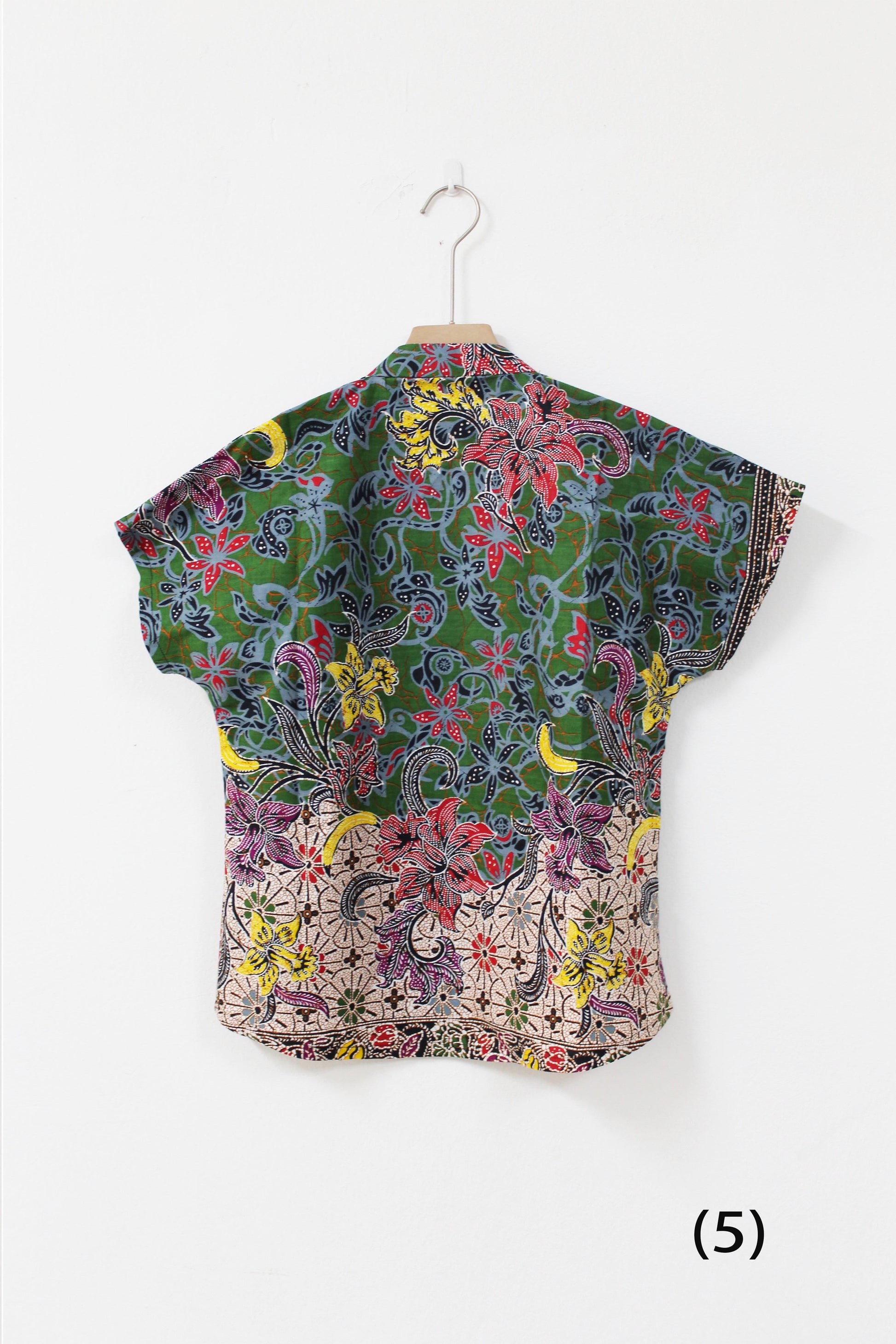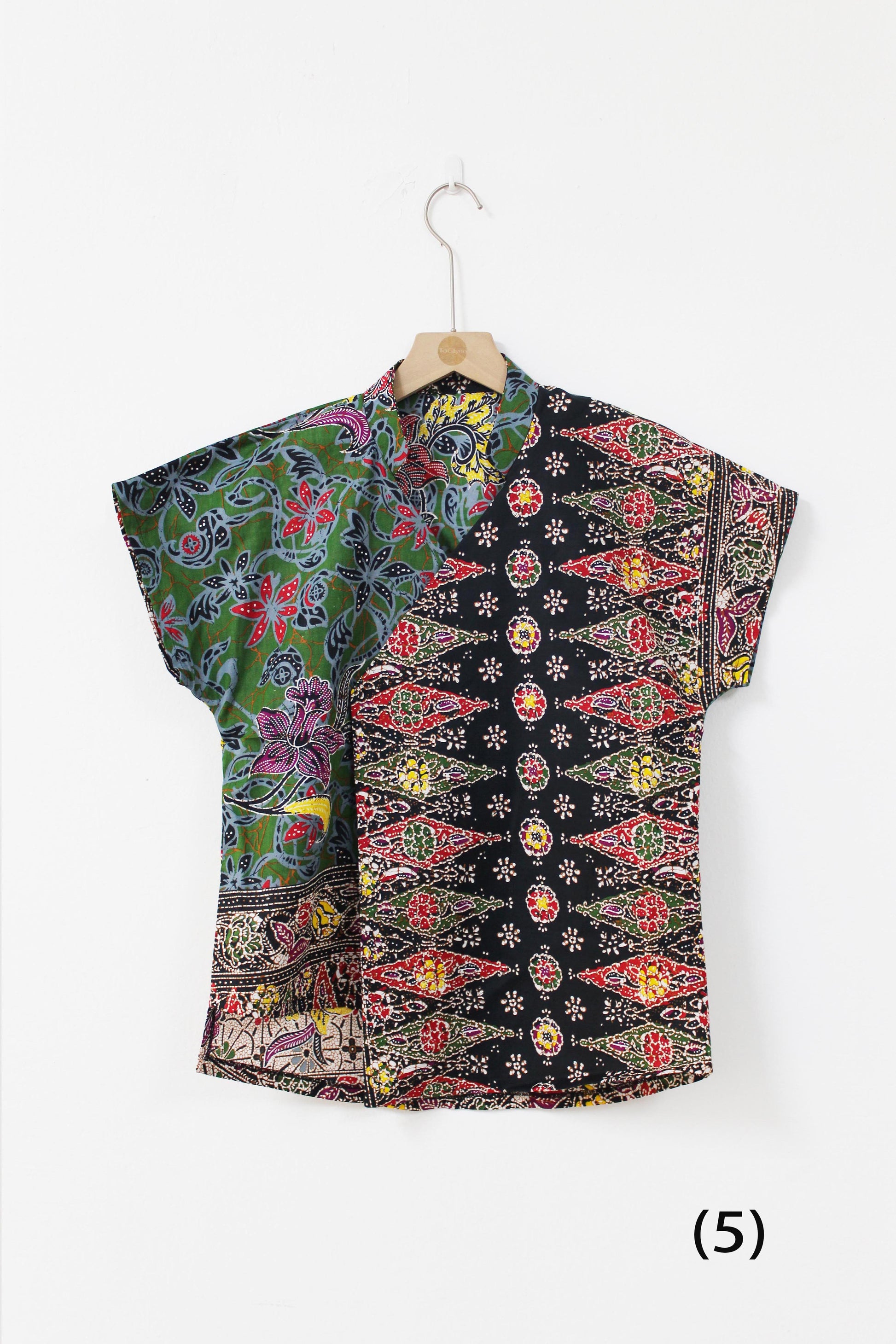 Introducing our women's batik V-Neck collar top. This unique piece features a stylish front snap button closure , eye catching irregular front hen, blending comfort with contemporary flair.