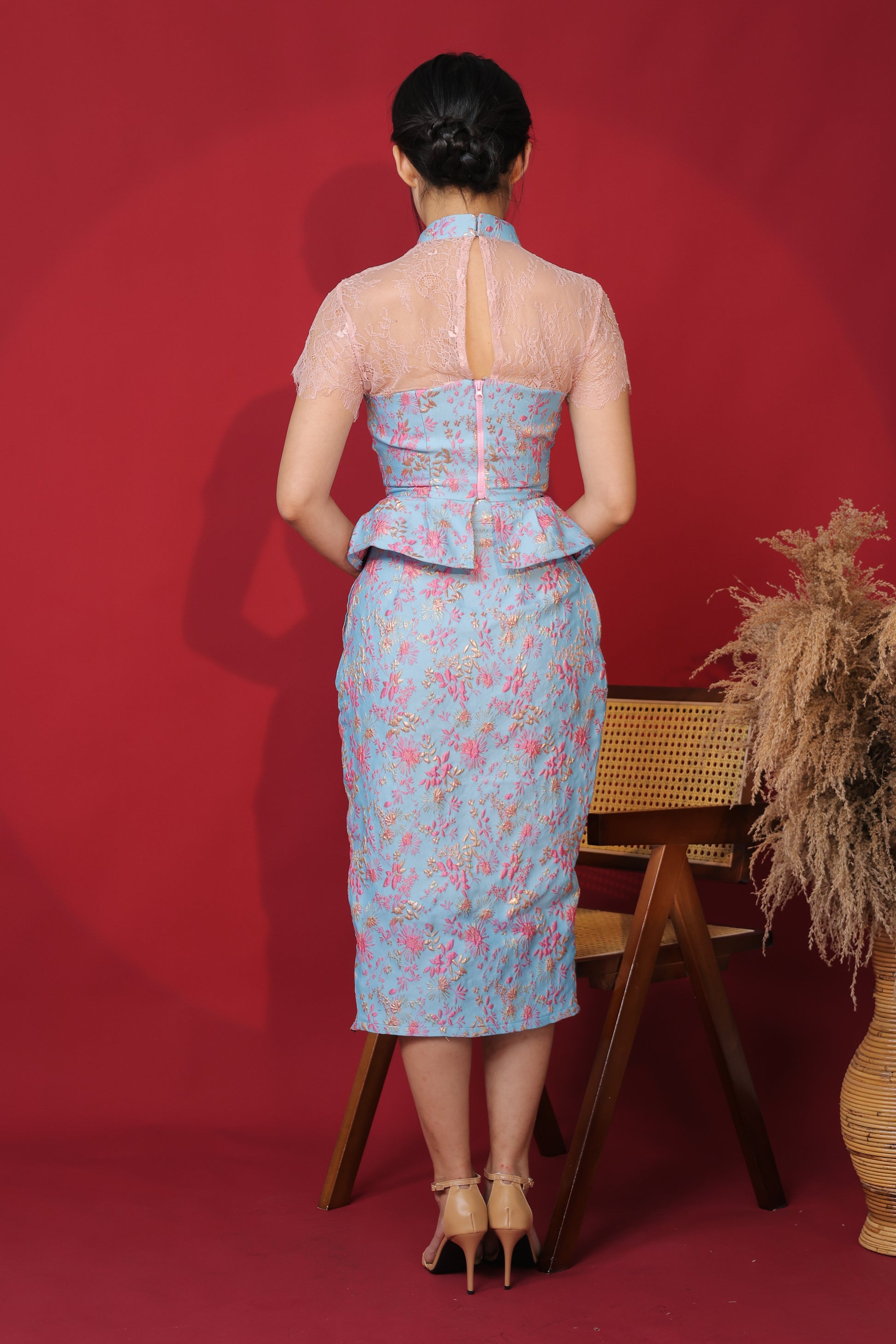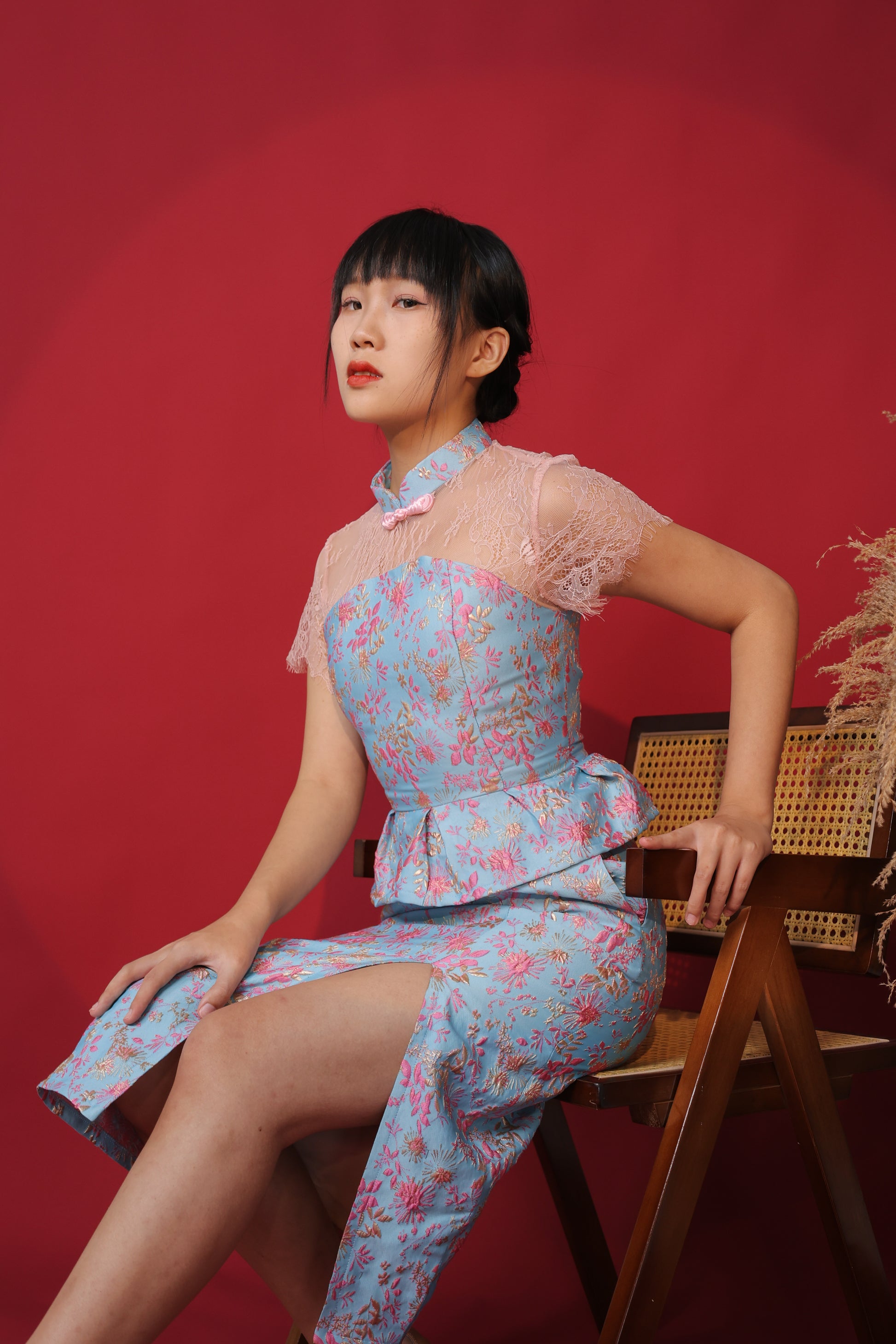 Crafted from luxurious floral jacquard brocade fabric, it features intricate details, including delicate lace on the shoulders and a chic ruffle at the bottom. This piece combines a youthful, contemporary flair, making it the ideal choice for those seeking a sophisticated yet trendy look. Whether you're attending a formal gathering or a festive celebration, this top will ensure you stand out with grace and style.